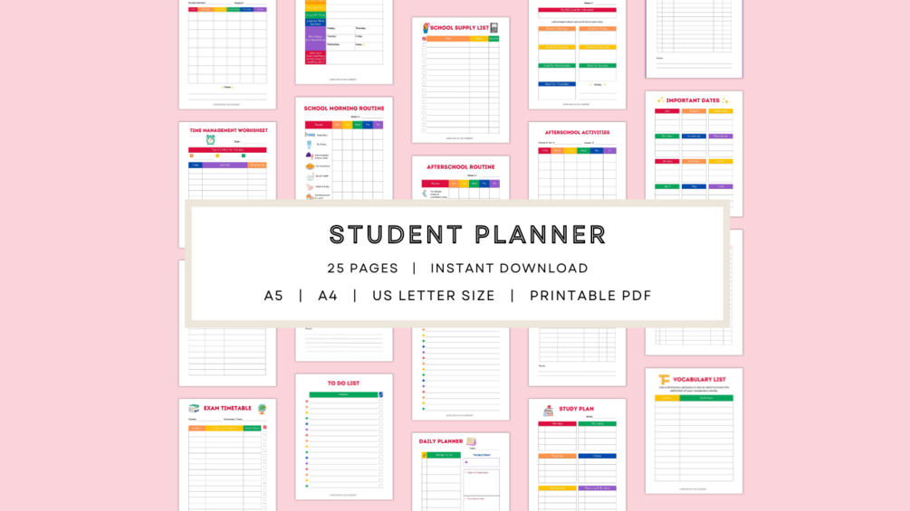 25 page Student Planner in 3 sizes - A4, A5, and US Letter
