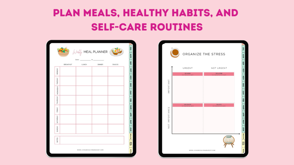 Also, this planner is simpler and less overwhelming than other digital planners out there. Busy moms don't need 300+ pages with super tiny print (that requires reading glasses to read). Instead, you need the basics like meal planning and to be able to find things easily and some prompts for self care.
